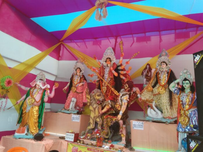 ठीक इसी के पीछे के भव्य, सुन्दर और रंगीन टेराकोटा से चित्रित एवं सज्जित महल में प्रतिवर्ष बंगाल से आये मूर्तिकार कलाकारों द्वारा निर्मित दुर्गा की भव्य आकर्षक प्रतिमा स्थापित होती थी,जिसे देखने देश-विदेश के मेहमानों तथा श्रद्धालुओं की भारी भीड़ जुटती थी।