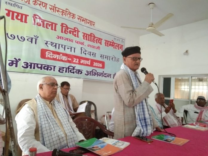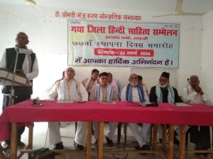 गया जिला हिंदी साहित्य सम्मेलन का 77 वां स्थापना दिवस आजाद पार्क गया के ‘डॉक्टर मंजू करण सभागार’ में बड़े ही धूमधाम से संपन्न हुआ। मगध प्रमंडल के उच्च कोटी के मगही, उर्दू एवं हिंदी के कवि लेखक एवं वरिष्ठ साहित्यकार श्री मुद्रिका सिंह को उनके उल्लेखनीय योगदान के लिए “वागीश्वरी सम्मान-2026” से उन्हें नवाजा गया और उन्हें प्रशस्ति पत्र,मोमेंटम एवं चादर देकर सम्मानित किया गया।